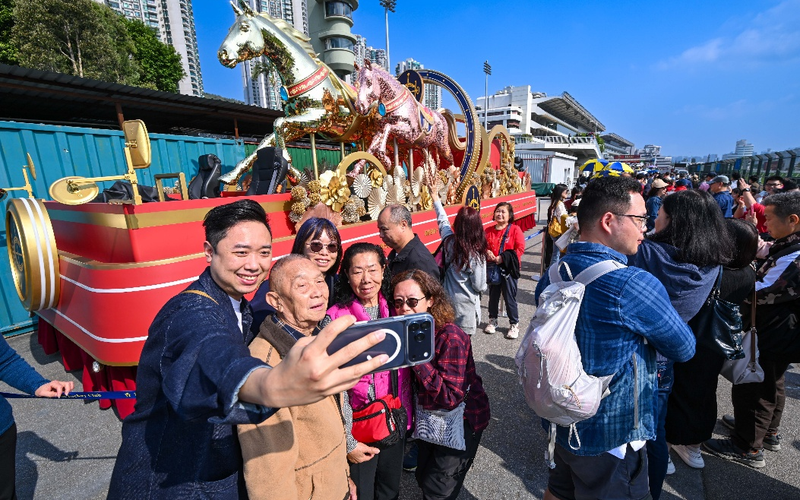 旅客在马场内与投入“新春国际汇演之夜”的花车打卡。