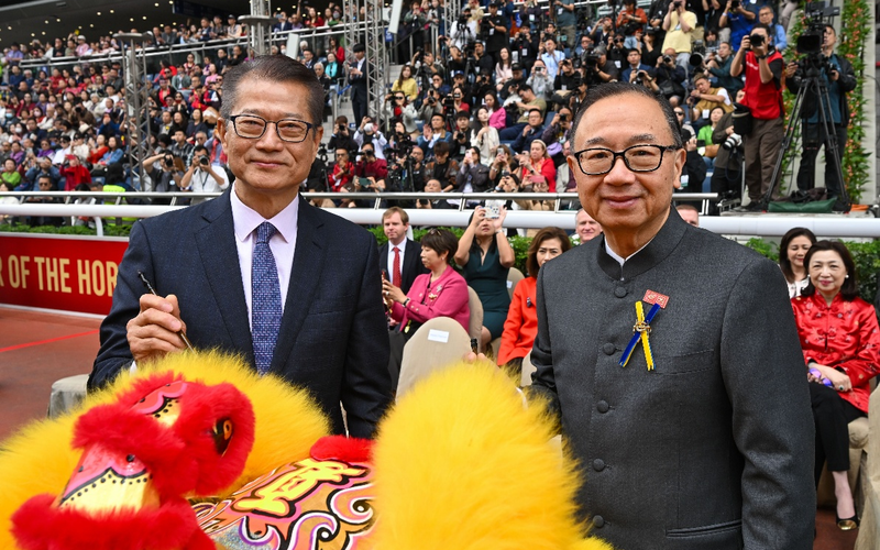 香港止境行政区政府财政司司长陈茂波(上图,左),和香港跑马会主席廖长江(上图,右);香港止境行政区政府文化体育及旅游局局长罗淑佩(下图,右),和香港跑马会行政总裁应家柏(下图,左)于2026马年跑马日开幕典礼主捏醒狮点睛典礼。