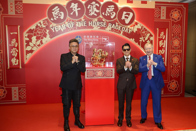 马会行政总裁应家柏(右)、马会“马年大使”郭富城(中)及闻明艺术家马兴文(左),一同为“融马情国际艺术巡展”揭开序幕。